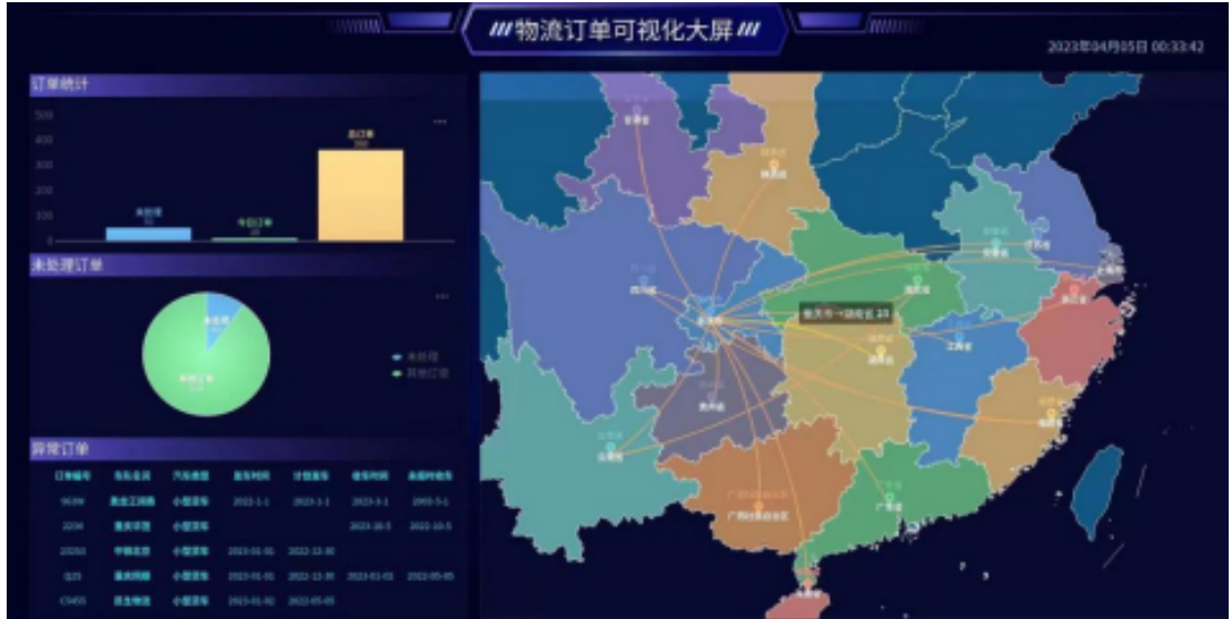 功能描述:基于ECharts构建动态大屏,实时展示订单在途情况、车辆利用率等主题。