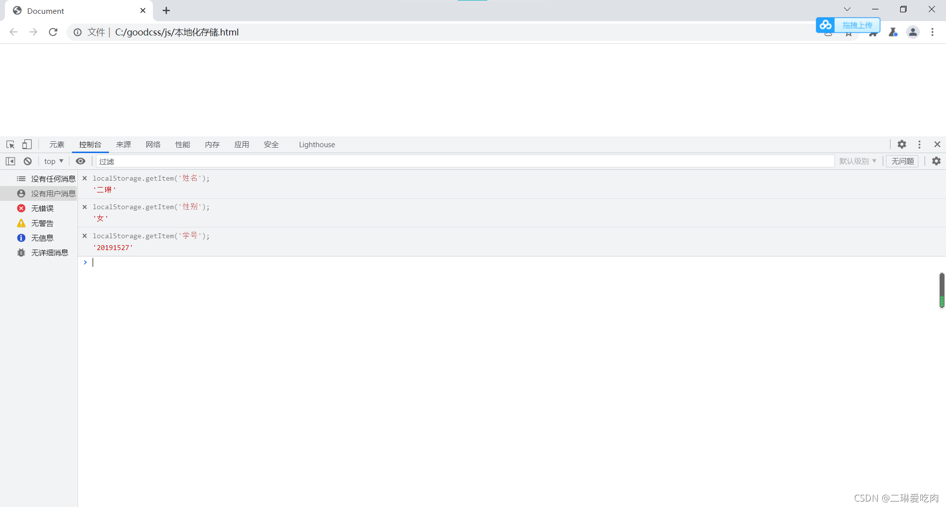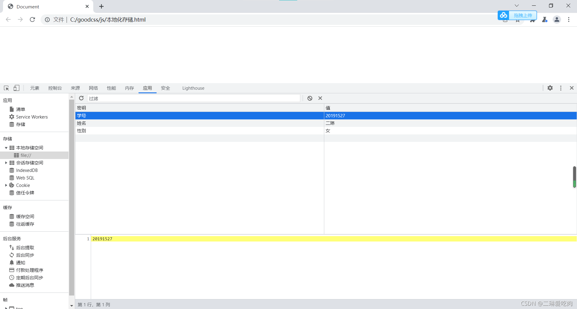 localStorage.setItem('学号', 20191527);