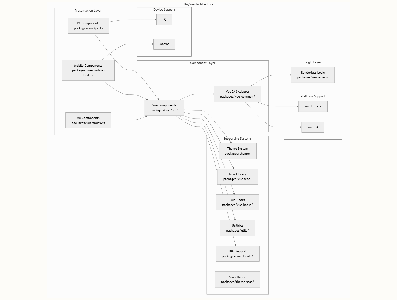 TinyVue 采用先进的无渲染组件架构,将展示逻辑与业务逻辑分离。这种设计模式使组件能够在不同场景下高度定制和复用。该架构基于使用 pnpm workspaces 的monorepo 结构构建,高效管理多个相互依赖的包,同时确保整个代码库的版本一致性。